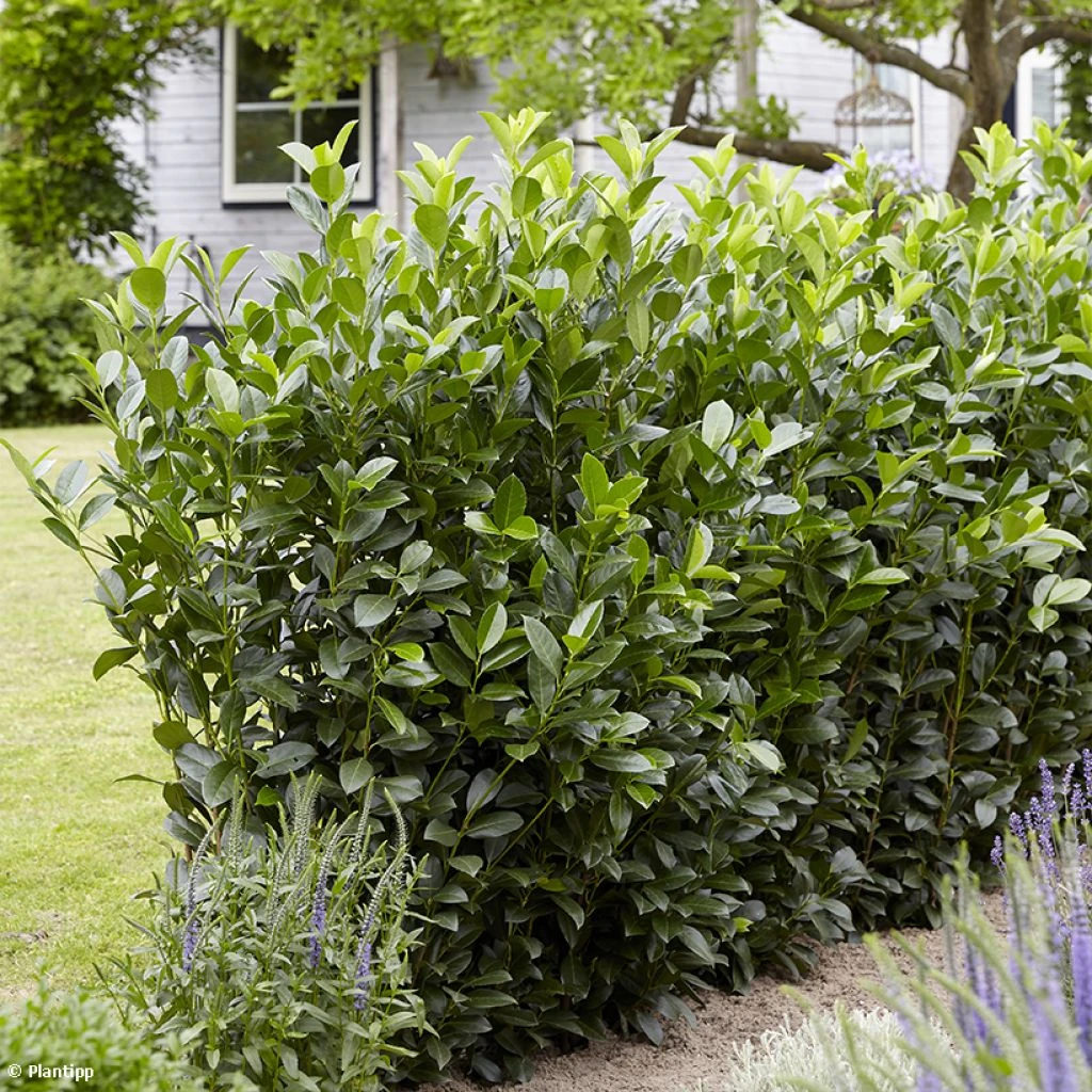 Originaire du sud-est de l’Europe et d’Asie Mineure, indigène en Iran, dans le Caucase et de Turquie, le Prunus laurocerasus est un arbuste persistant pouvant atteindre une grande taille (jusqu’à 8 m de haut) et même former de véritables troncs. L’espèce a donné plusieurs cultivars, souvent utilisés en haie, et notamment ‘Obelisk’ particulièrement adapté à cet usage.